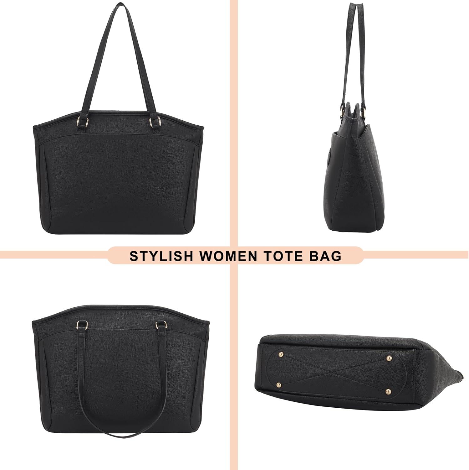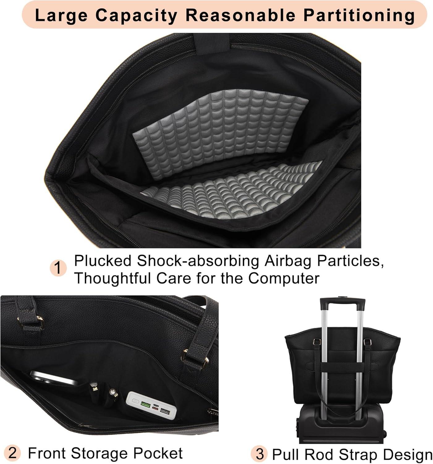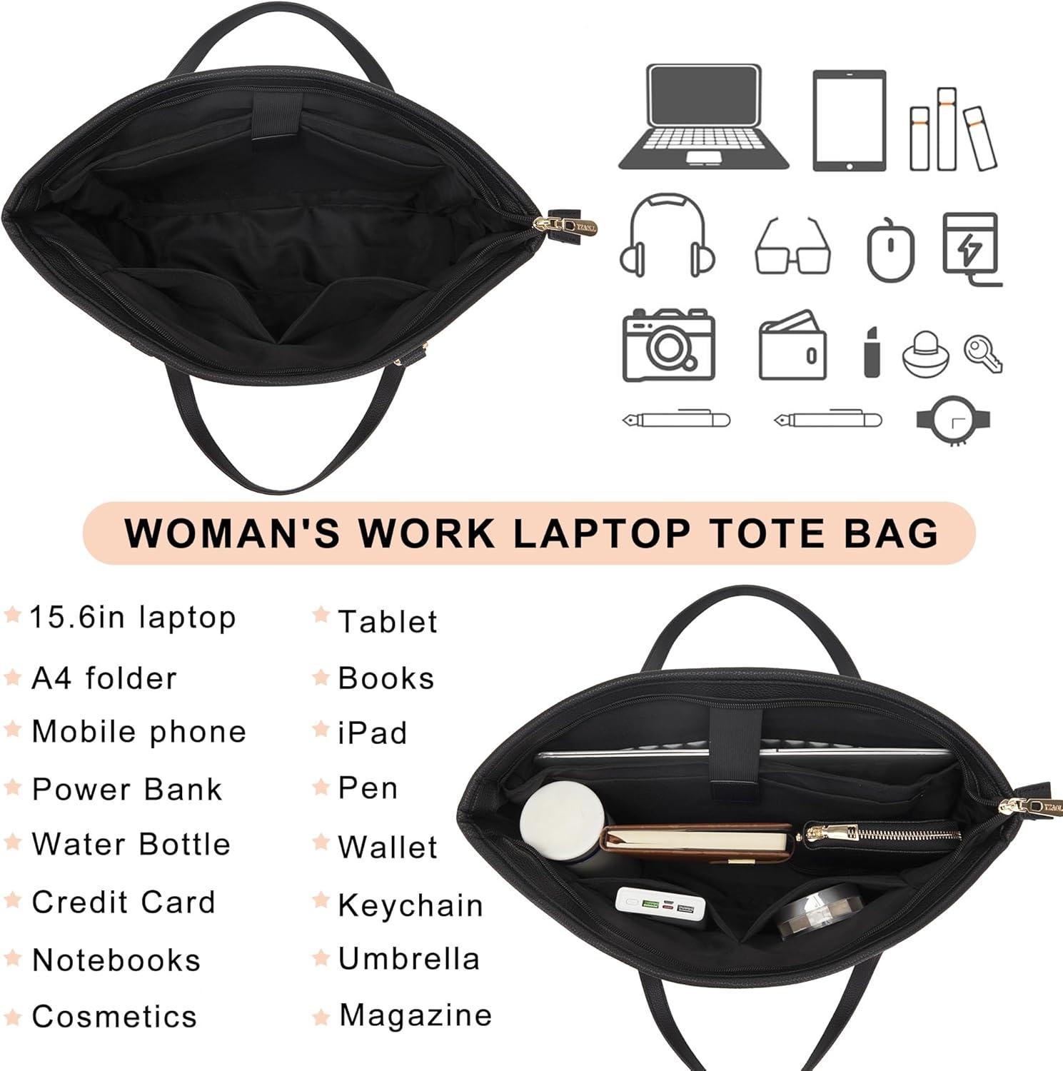 YZAOLL 15.6 Inch Laptop Tote Bag for Women,Lightweight Water-resistant Vegan Leather with Padded Sleeve Multi-Pocket Work Bag(Black)